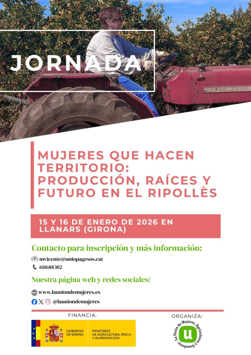 La Unión de Mujeres Agricultoras y Ganaderas organiza una jornada GRATUITA de "MUJERES QUE HACEN TERRITORIO: PRODUCCION, RAICES y FUTURO", se celebrará los días 15 y 16 de enero de 2026 en horario de 9:30 a 18:30 en la localidad de Llanars (Girona).