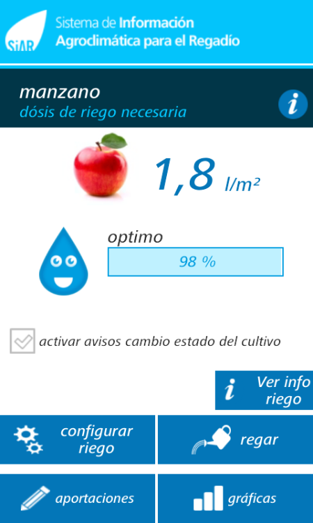 La Dirección General de Desarrollo Rural y Política Forestal ofrece la aplicación gratuita para teléfono móvil: Sistema de Información Agroclimática para el Regadío (SiAR), para gestionar el regadío en más de 100 cultivos, personalizando la ubicación, suelo, sistema de riego, fecha de siembra, y promover la sostenibilidad económica, social y medioambiental de la actividad agraria.