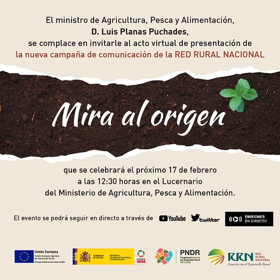El próximo miércoles 17 de febrero de 2021, a las 12:30 horas, tendrá lugar el acto de presentación de la nueva Campaña de Comunicación de la Red Rural Nacional: SENSIBILIZACIÓN DE LA POBLACIÓN SOBRE EL MUNDO RURAL Y LA IMPORTANCIA DE LOS PROGRAMAS DE Políticas de Desarrollo Rural, que se retransmitirá virtualmente desde el Lucernario del Ministerio de Agricultura, Pesca y Alimentación.