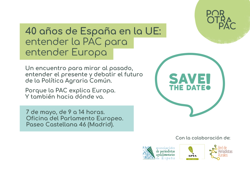 A Coalición por outra PAC organiza o encontro “40 anos de España na UE: comprender a PAC para entender Europa” o 7 de maio de 2026 , pola mañá ( 9:00-14:00 h ), na sede do Parlamento Europeo e da Comisión Europea en Madrid .
