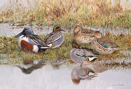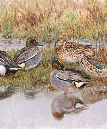 Un pato cuchara y varias cercetas comunes sestean en el borde de la marisma. Las zonas húmedas están amenazadas por la contaminación, la destrucción de la vegetación de borde y las actividades recreativas, lo que impide el desarrollo del ciclo vital de muchas especies, tanto reproductoras como invernantes.