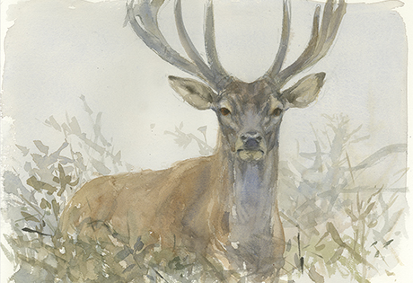 Un ciervo aparece de entre la bruma y los matorrales de las marismas del Parque Nacional de Doñana.