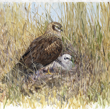 Una hembra de aguilucho y sus pollos están en su nido escondido entre las plantas de un campo de cereal, siempre bajo la amenaza de que las cosechadoras les arrollen. Adecuar la cosecha a períodos de no crianza de estas aves tiene la ventaja para el agricultor de que no esquilma una especie que mantiene a raya a las plagas de roedores e insectos.