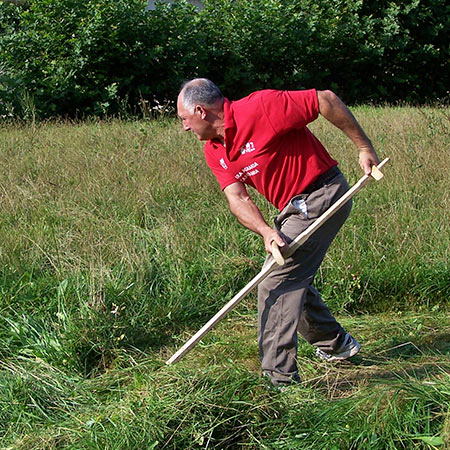 Siega del pasto fresco en zonas abruptas de montaña; se realiza a mano, con el uso del “dalle”, de forma tradicional.