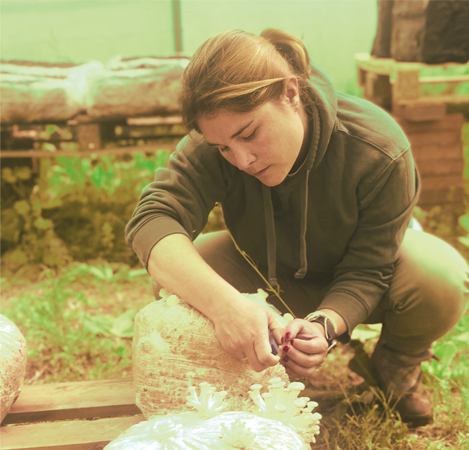 Nazaret Mateos abriendo primordios. Cada saco de sustrato lleva la mezcla más adecuada para cada especie.