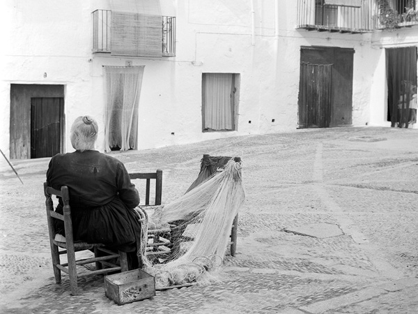 Una mujer trabaja las redes de pesca en una plaza de casas encaladas en Peñíscola (Castellón).