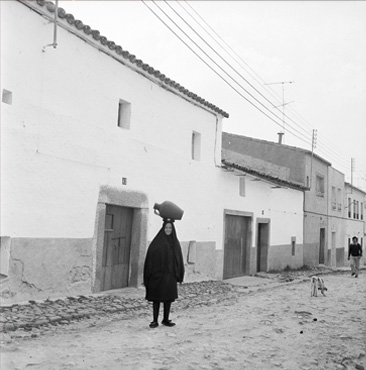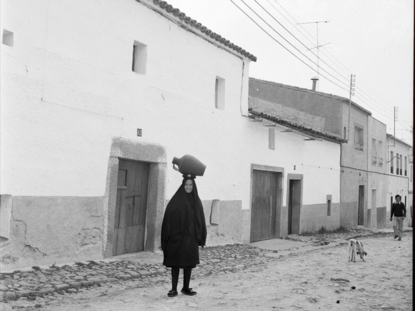 En Arroyo de la Luz (Cáceres), una mujer traslada una cántara en su cabeza por una calle de tierra, mientras un niño y un perro se aproximan a lo lejos.