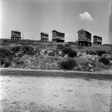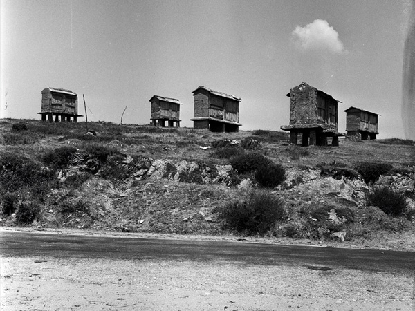 Conjunto de hórreos empleados para almacenar granos y otros productos agrícolas, en Santás (Ourense).