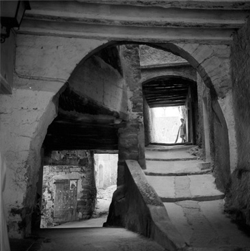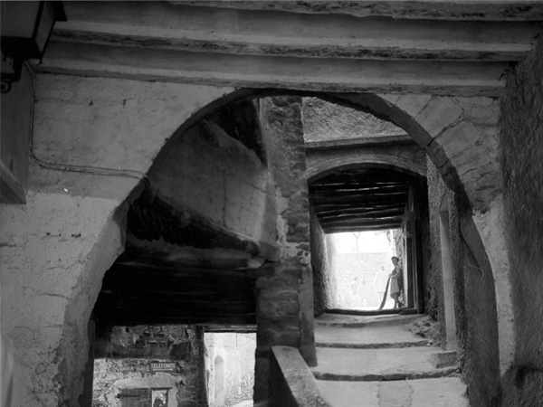 Zona de paso entre unos soportales, delimitada por los arcos de los edificios superiores, en Ager (Lleida).