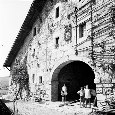 Caserón de piedra con cubierta inclinada en Abadiano (Vizcaya). En su fachada se aprecia un escudo, lo que denota la relevancia del edificio en su entorno.