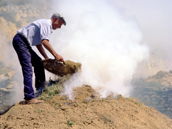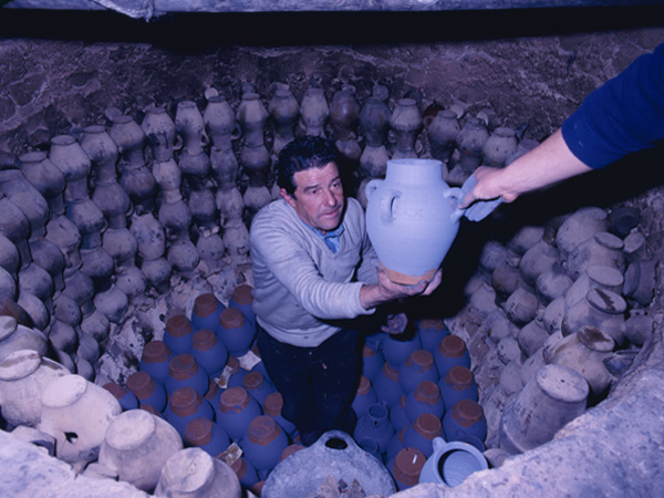 En estos hornos del pre-pirineo oscense, a bóveda abierta, las piezas se colocan por tamaños, boca abajo, para que les entre humo y llamas y cuezan correctamente.