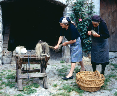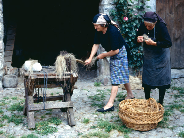Dos vecinas de San Juan de Plan (Huesca) separan la fibra de la borra en el rastrillo o “rebús”. Es solo una más de las labores del ciclo del cáñamo, entre la siembra y la elaboración de hilo.