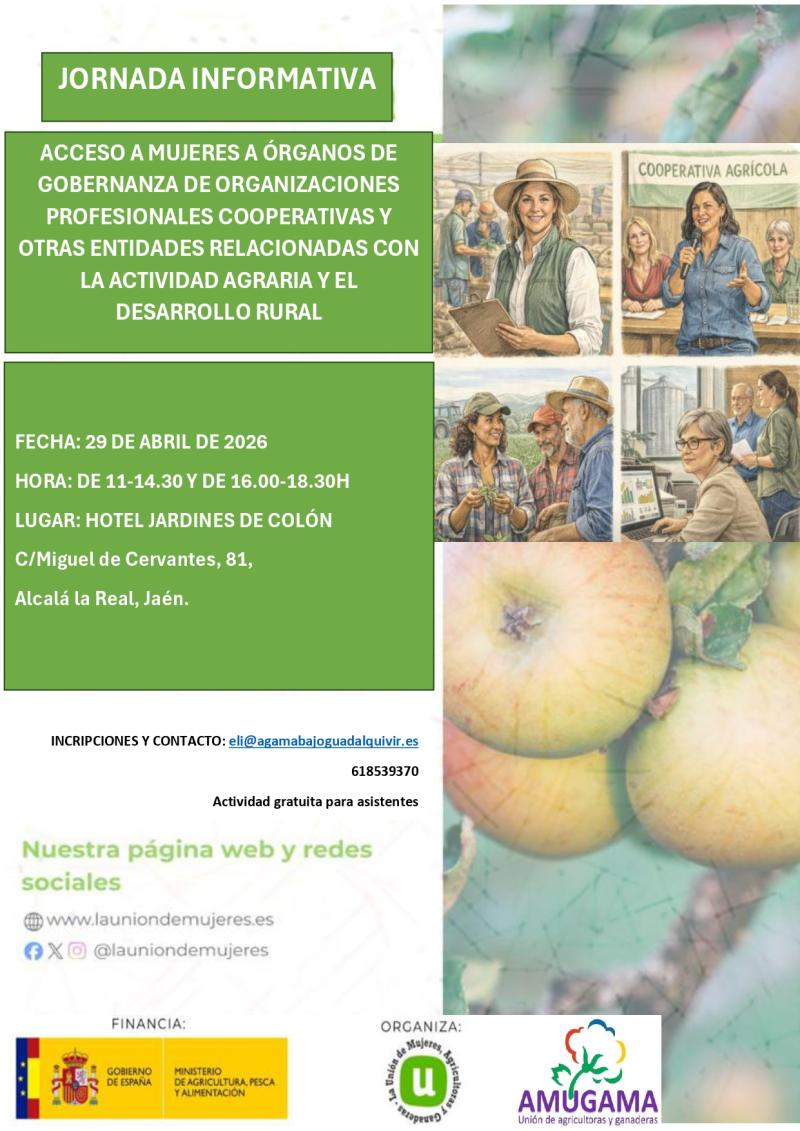 La Unión de Mujeres Agricultoras y Ganaderas organiza una jornada gratuita de “ACCESO A MUJERES A ÓRGANOS DE GOBERNANZA DE ORGANIZACIONES PROFESIONALES COOPERATIVAS Y OTRAS ENTIDADES RELACIONADAS CON LA ACTIVIDAD AGRARIA Y EL DESARROLLO RURAL MÁS VISITA TÉCNICA”. Un espacio para reflexionar, compartir experiencias y promover la igualdad en la toma de decisiones, que incluirá además una visita técnica para conocer buenas prácticas en el territorio.