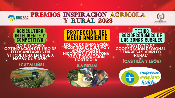 Els Premis d'Inspiració Agrària i Rural ARIA 2023 , successors dels Premis d'Inspiració Rural , ja tenen 24 finalistes a nivell europeu per rebre un possible guardó dins de la seva categoria temàtica de la mà de la Xarxa Europea de la PAC . La Xarxa PAC ha estat l'entitat encarregada a Espanya de seleccionar els millors projectes presentats a cadascuna de les categories i, com a tals, ha fomentat la participació i ha estudiat les candidatures per enviar a la Unió Europea.