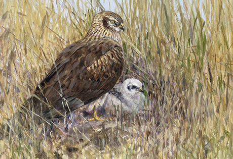 Una hembra de aguilucho y sus pollos están en su nido escondido entre las plantas de un campo de cereal, siempre bajo la amenaza de que las cosechadoras les arrollen. Adecuar la cosecha a períodos de no crianza de estas aves tiene la ventaja para el agricultor de que no esquilma una especie que mantiene a raya a las plagas de roedores e insectos.