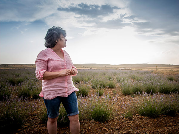 Montse García (54 años). Nació y vive en Noviercas (100 habitantes). Está titulada en Geología, pero es propietaria de una plantación de lavanda destinada a la fabricación de aceite y jabones naturales. También trabaja de guía turística en la zona.