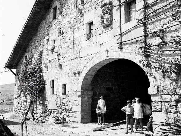 Caserón de piedra con cubierta inclinada en Abadiano (Vizcaya). En su fachada se aprecia un escudo, lo que denota la relevancia del edificio en su entorno.